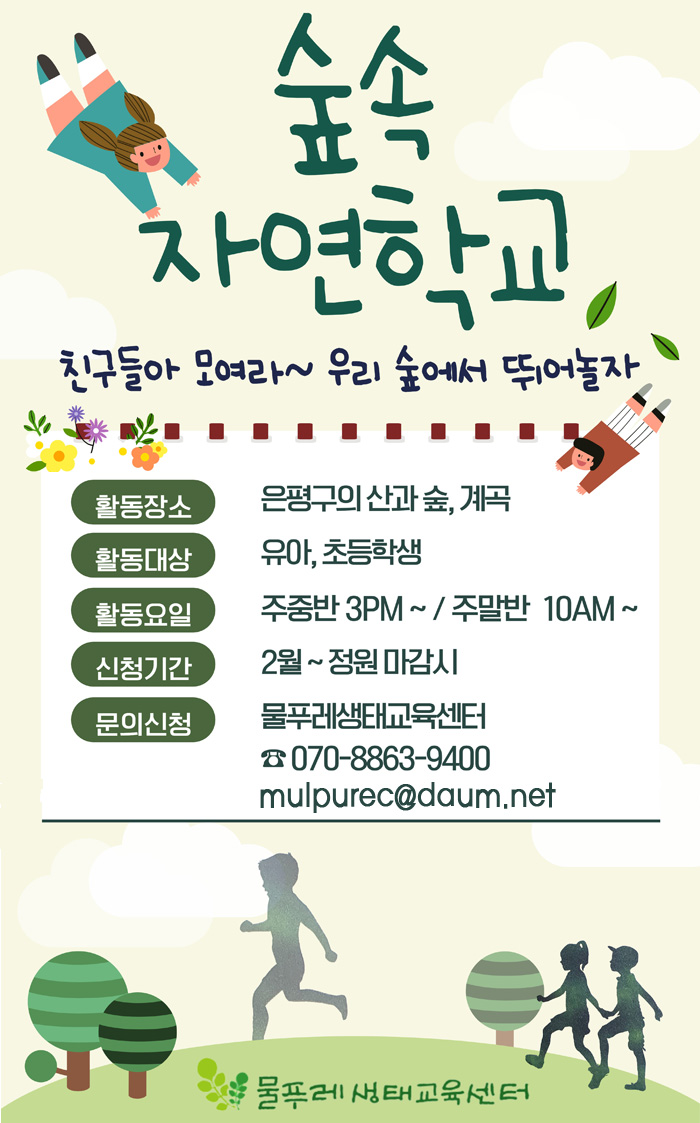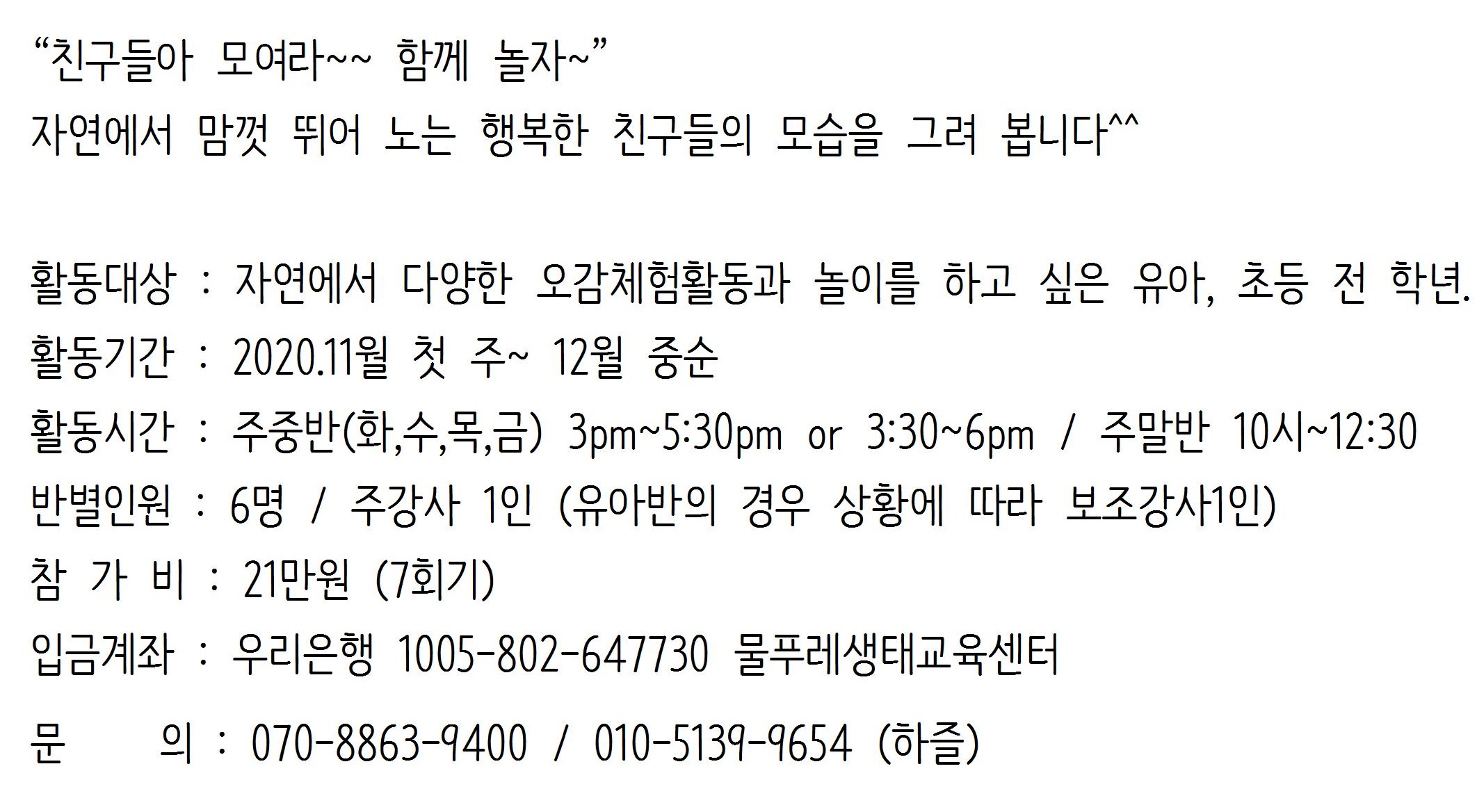 | 2020 숲속자연학교-하반기 모집 공지 (0) | 2020.09.02 |