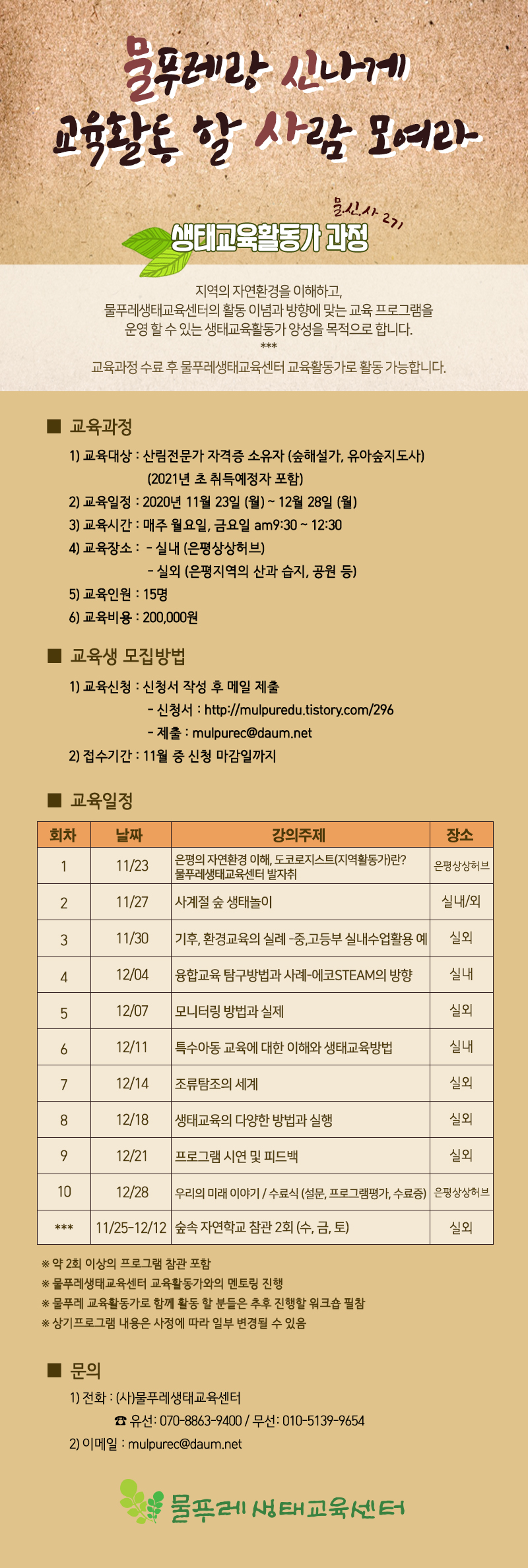 문의: (사)물푸레생태교육센터 070-8863-9400 / 010-5139-9654 / 이메일 : mulpurec@daum.net