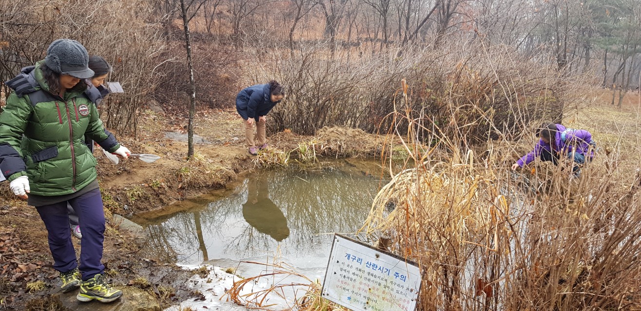 강서구 위치한 꽃을 닮은 아름다운 산 개화산 몇 년 전 개화산 계곡에 개구리를 이주시키고 난 뒤 돌보지 않던 곳을 강서 물푸레생태교육센터는 모니터링을 시작했습니다. 산개구리 종류에 계절에 따른 개구리 산란과 번식 주변 환경의 변화를 모니터링하고 있어요. 매년 구정을 기준으로 모니터링을 진행하고 산개구리 산란시기에는 주 1회/ 5월 이후에는 월 1회 정도로 참개구리와 생물상의 변화를 모니터링하고 있습니다. 물푸레 회원들로 이루어진 강서 하늬가람 모임은 생물상 모니터링을 통해 서식 생물과 주변 학생들의 교육까지도 연계해서 진행하고 있고 지키기 위해 노력하고 있습니다.
