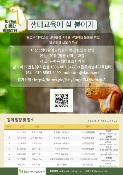 *역량강화프로그램 – 5/12~6/2 생태환경교육강사 및 일반 성인대상으로 진행된 현장중심 전문가 특강으로 총7회 진행.