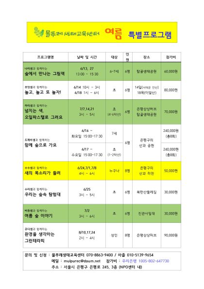 *여름특별프로그램- 7~8: 은평국 활동강사님들의 역량별 특화프로그램으로 1~5회 진행 '숲에서 만나는 그림책','놀고 놀고 또 놀자','여름밤 숲 탐험', '숲속탐험대', 등의 이름으로 유아에서부터 초등학생까지 숲에서 다양한 놀이와 관찰 등 오감체험활동 진행했습니다.  은평구 내 아름다운 숲과 공원이 있음에 감사하고 친구들과 어울려 즐거운 숲체험을 할 수 있어 감사하다는 참여자들의 이야기로 담지 못한 내용들을 대신 합니다~   덧붙여, 은평활동가분들의 특별한 재능과 아이들과 자연에 대한 열정에 무한 감사드린다는 이야기도 전하면서^^