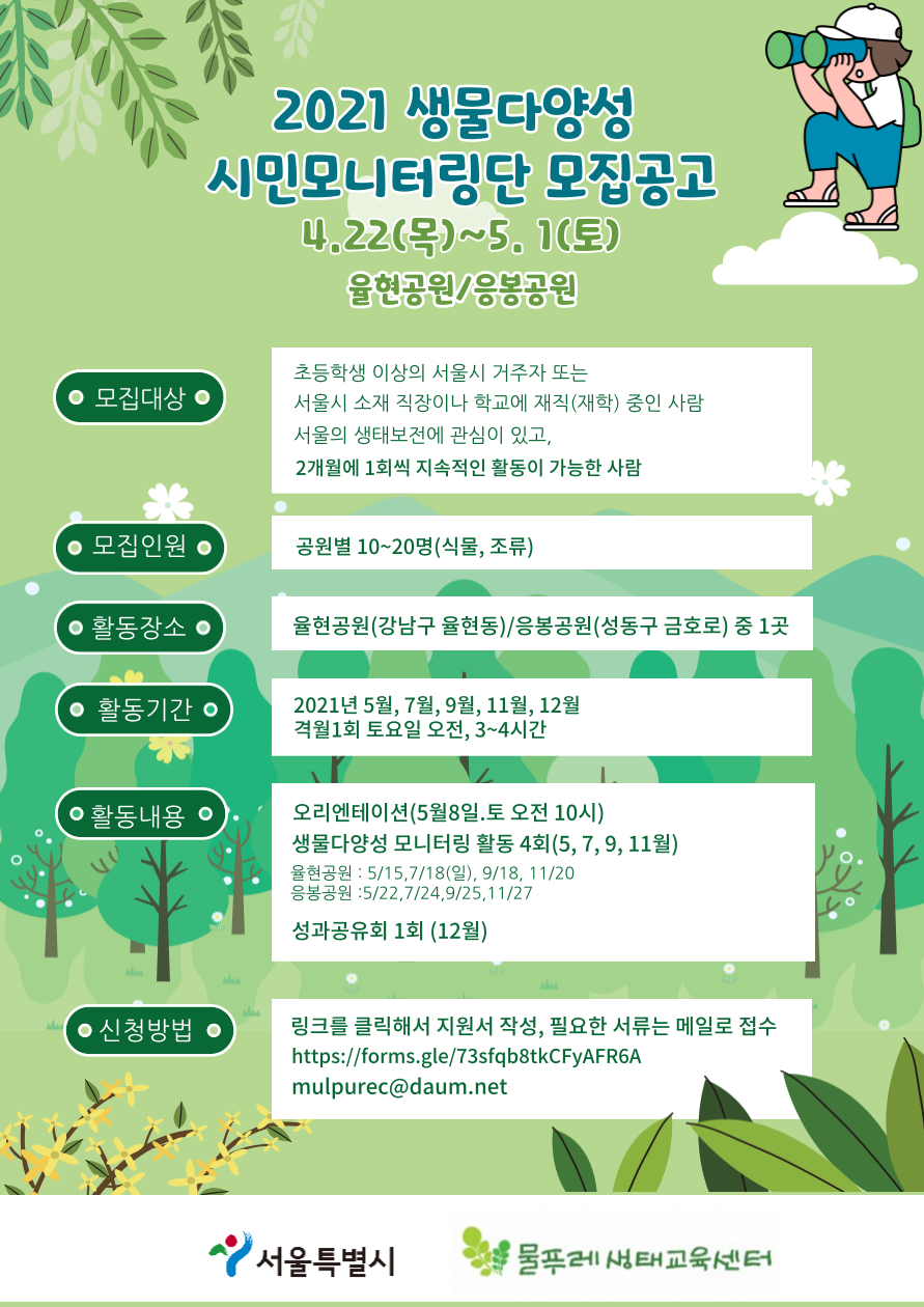 ※ 2019년, 2020년에 ‘생물다양성 공원모니터링단’에 참여했을 경우도 신청 가능함 (단, 활동에 50%이상 불참하였을 경우, 신청자가 많을 시 제외될 수 있습니다)