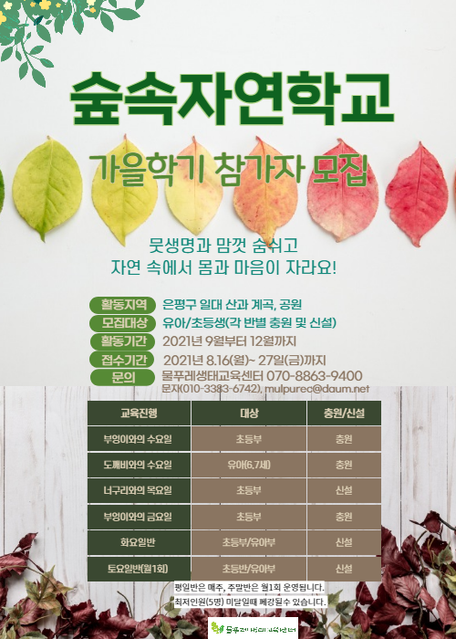 물푸레생태교육센터의 숲속자연학교가 하반기 참가자를 모집합니다.