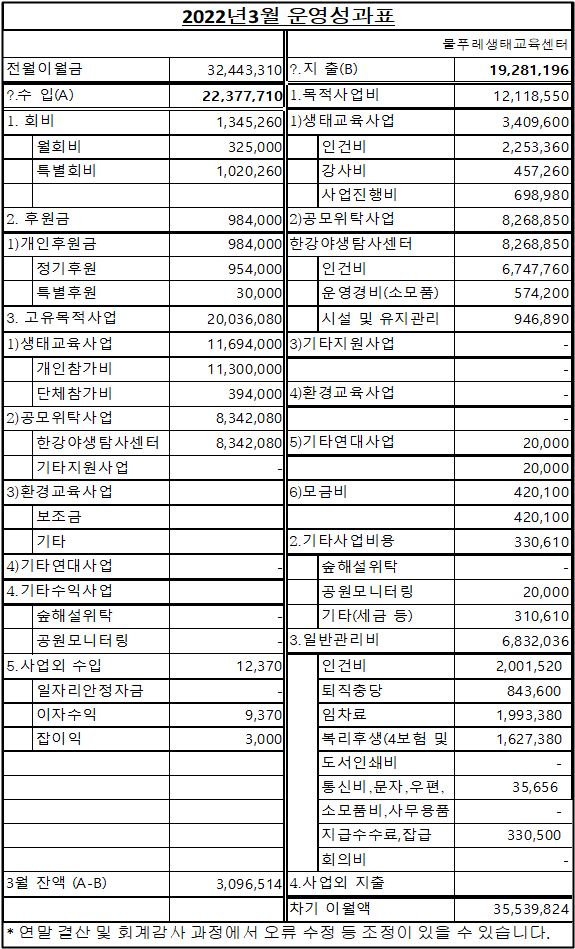 2022년 3월 운영성과표/물푸레생태교육센터