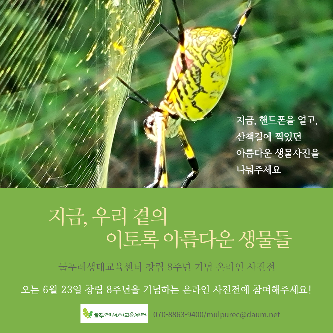 오는 창립기념일을 맞아 회원님들과 함께 ‘지금 우리 곁의 이토록 아름다운 생물들’이라는 제목으로 생명의 아름다움과 존엄성을 발견하는 시간을 가져보고자 합니다. 회원님들의 핸드폰 사진첩에 들어있는 멋진 사진을 찾아 물푸레사무국으로 보내주세요.