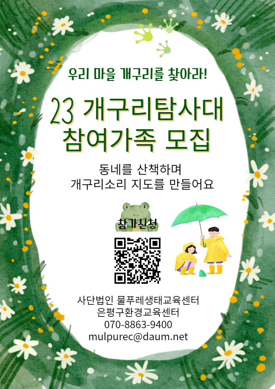 양서류는 어느 생물보다 환경오염에 민감해서 멸종할 위험이 가장 큰 생물입니다. 개발되어 없어지는 서식지, 수질오염, 기후변화에도, 힘찬 노래로 아직 우리와 함께 살고있는 개구리를 찾아봅시다. 우리동네는 개구리에게도 살만한 곳일까요? 동네를 산책하며 개구리의 노래소리를 제보하고, 동네 작은 습지를 보호하는 활동을 함께 해봐요!