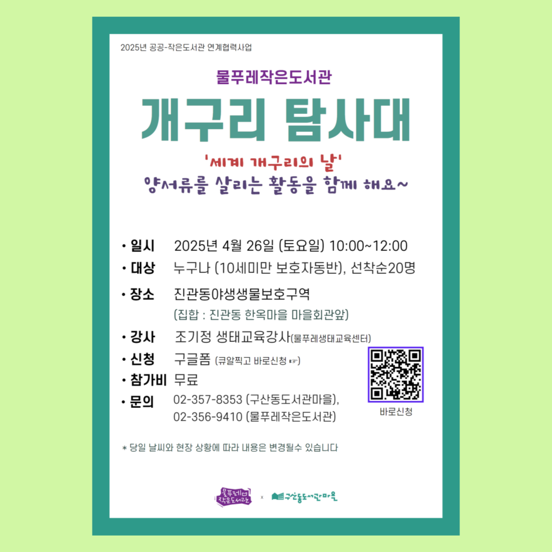 *물푸레작은도서관 개구리탐사대 강좌는 마감되었습니다.* ⠀