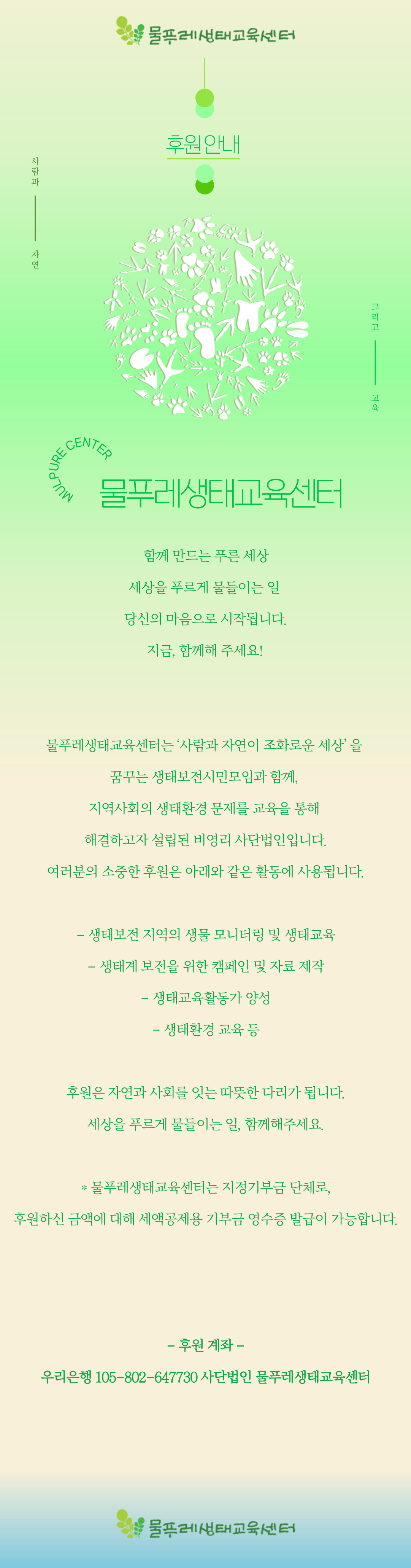 후원 안내 물푸레생태교육센터-후원 안내 물푸레생태교육센터 2025. 7. 29. 09:58 후원 구글폼 https://docs.google.com/forms/d/e/1FAIpQLSdWl37PV2SLGLgrOpeYM9O7cFuSxW4ZlUXKqLdPaEApzgv6Fg/viewform 후원가입 신청서 후원자님, 물푸레생태교육센터와 함께 해주셔서 고맙습니다. 물푸레생태교육센터는 더불어 살아가는 다양한 생명체들의 존엄성을 바탕으로, 교육을 통해 자연생명과 공존하는 길을 찾아가고 docs.google.com 후원 구글폼 공유하기 게시글 관리 물푸레생태교육센터 저작자표시 비영리 변경금지 (새창열림)