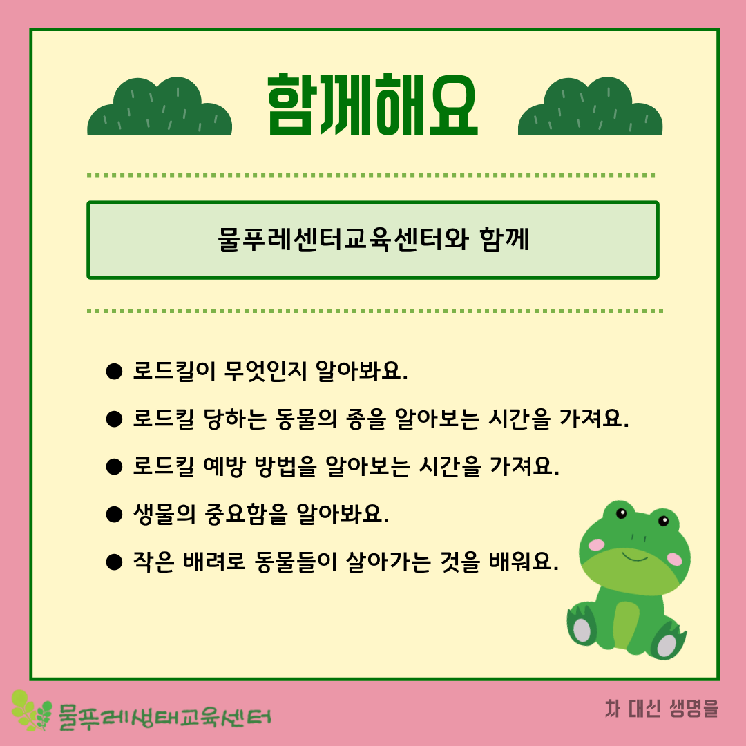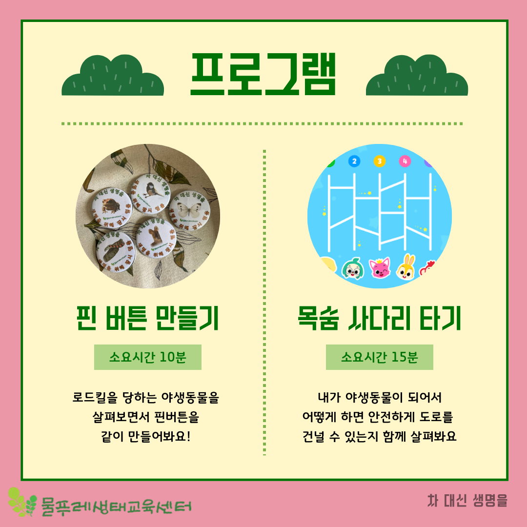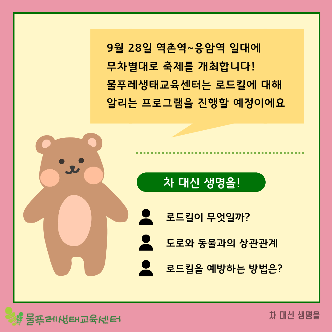 이번 축제에서 물푸레생태교육센터는 🐾“차 대신 생명을” 프로그램을 운영합니다.