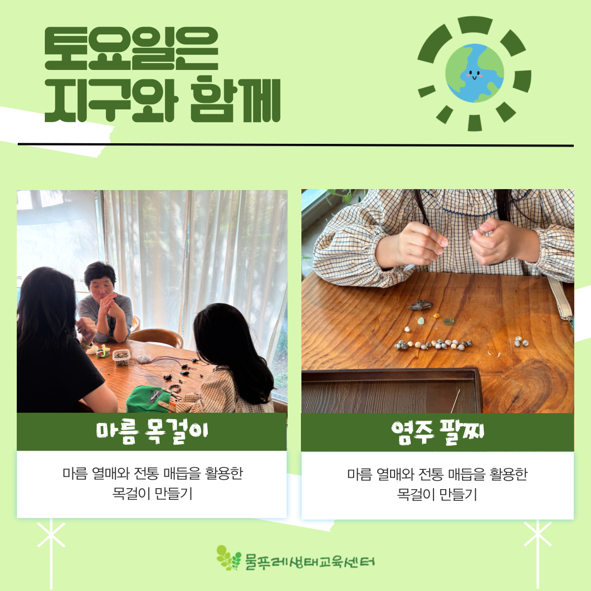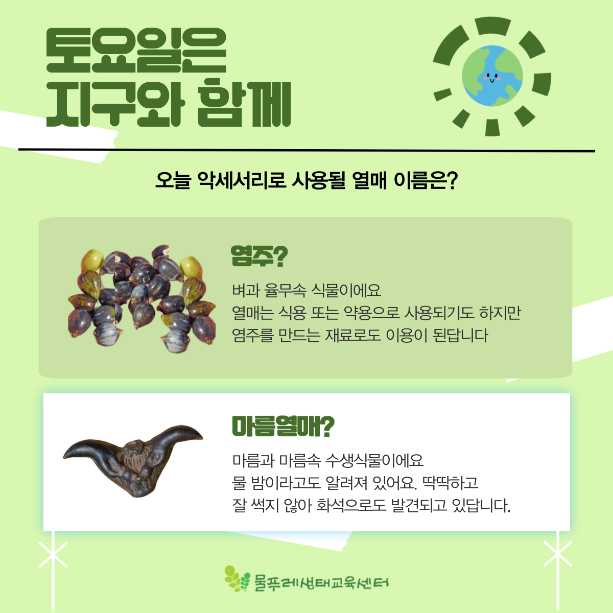 지난 주엔 자연이 선물해 준 열매들, ‘염주’와 ‘마름 열매’를 활용해 멋진 목걸이와 팔찌를 만들었어요.