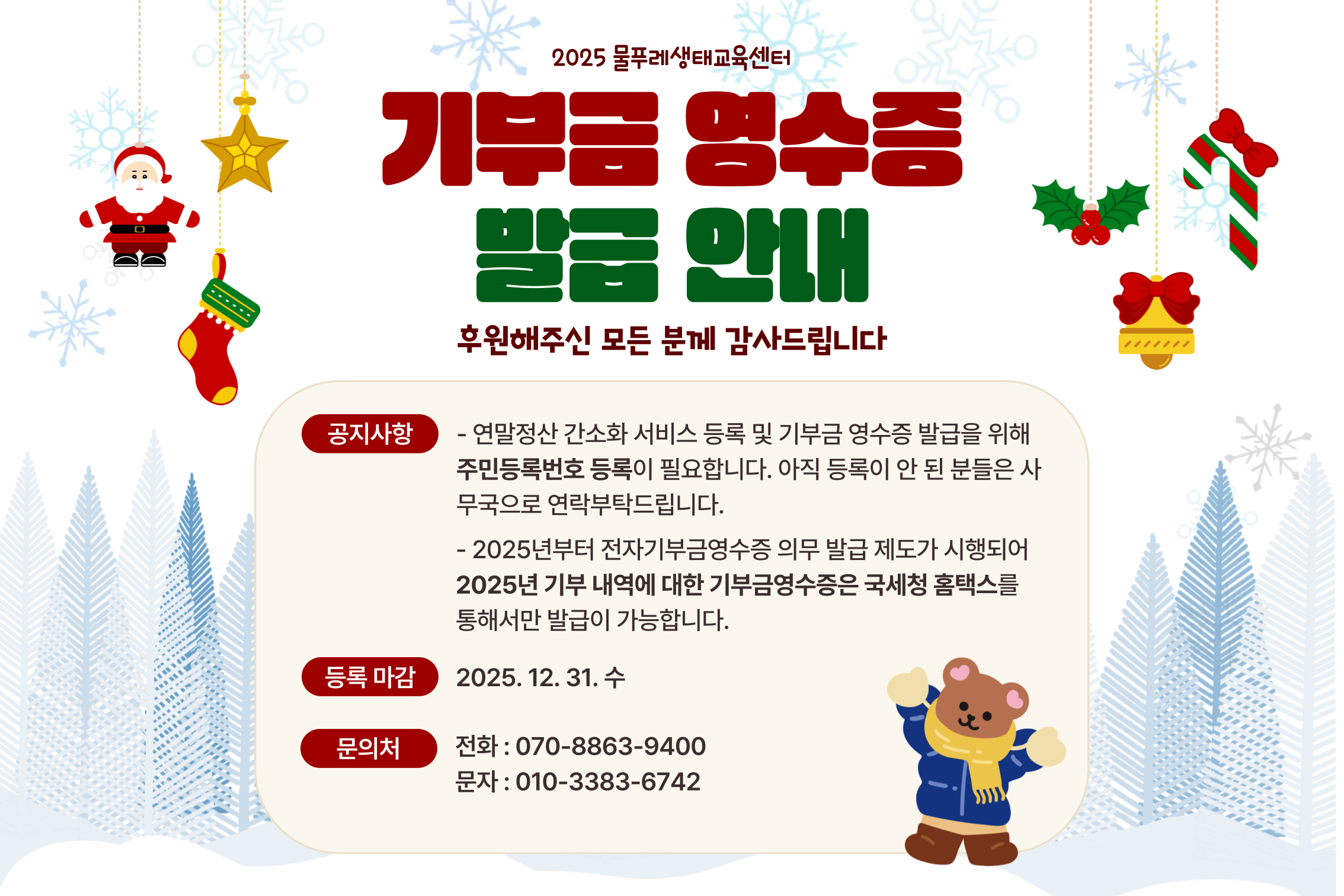 전자 기부금 영수증 의무 발급 제도가 시행됨에 따라, 물푸레생태교육센터에서 발급된 2025년 기부 내역의 기부금 영수증은 세액공제에 사용할 수 없습니다. 세액공제를 위해서는 국세청 홈택스를 통해 전자 기부금 영수증을 발급받아야 합니다.