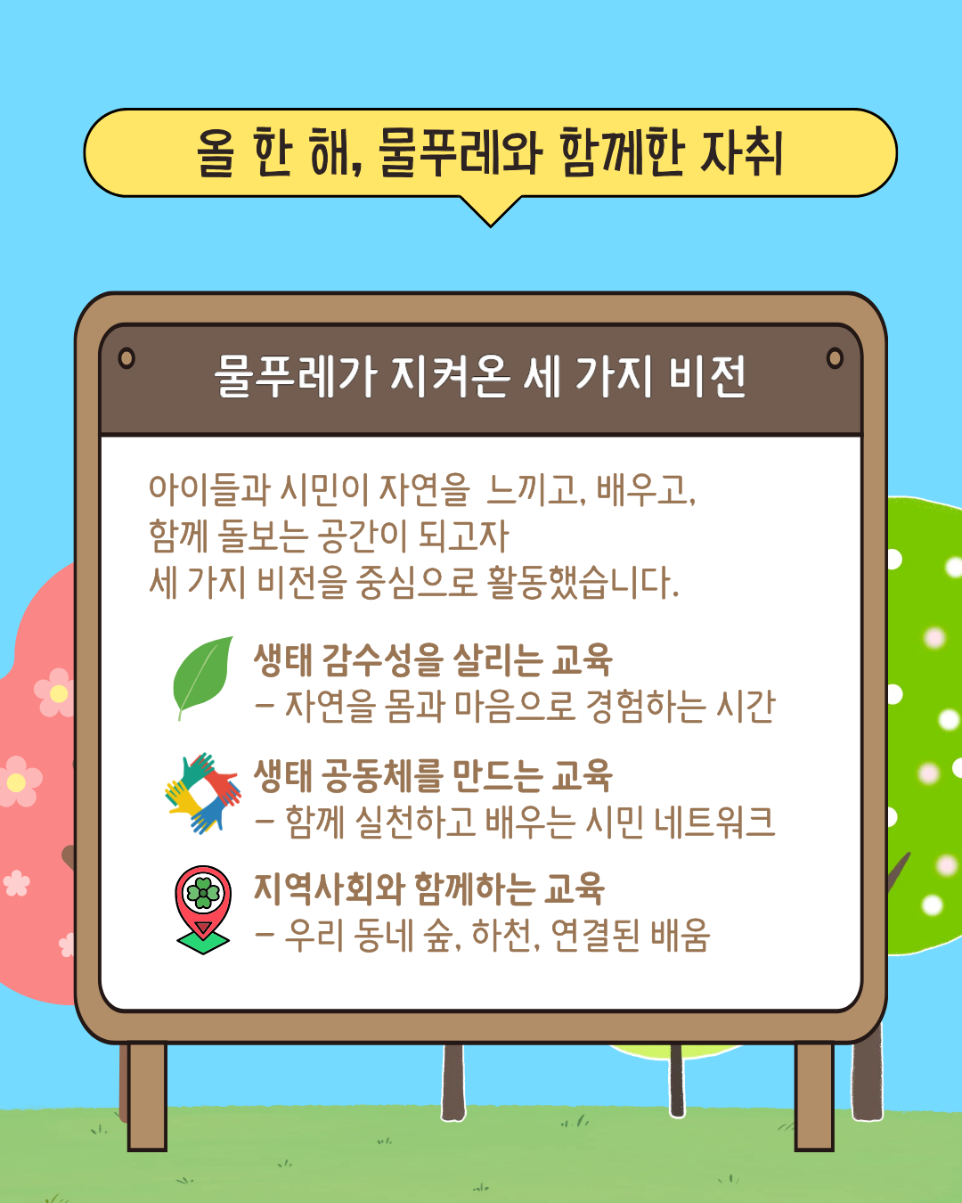 생태감수성을 만드는 교육, 생태공동체를 만드는 교육, 지역사회와 이어지는 생태 이야기.