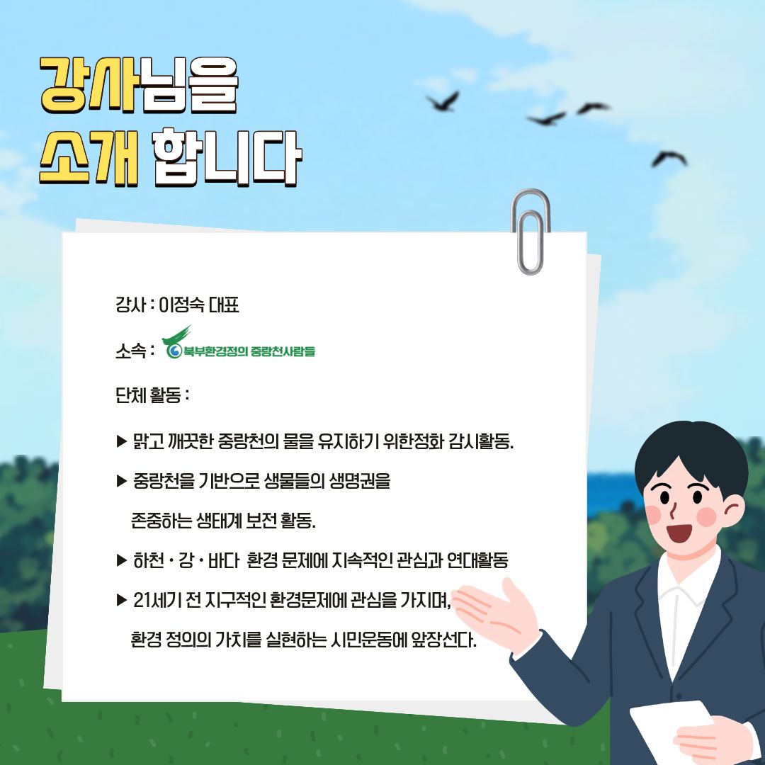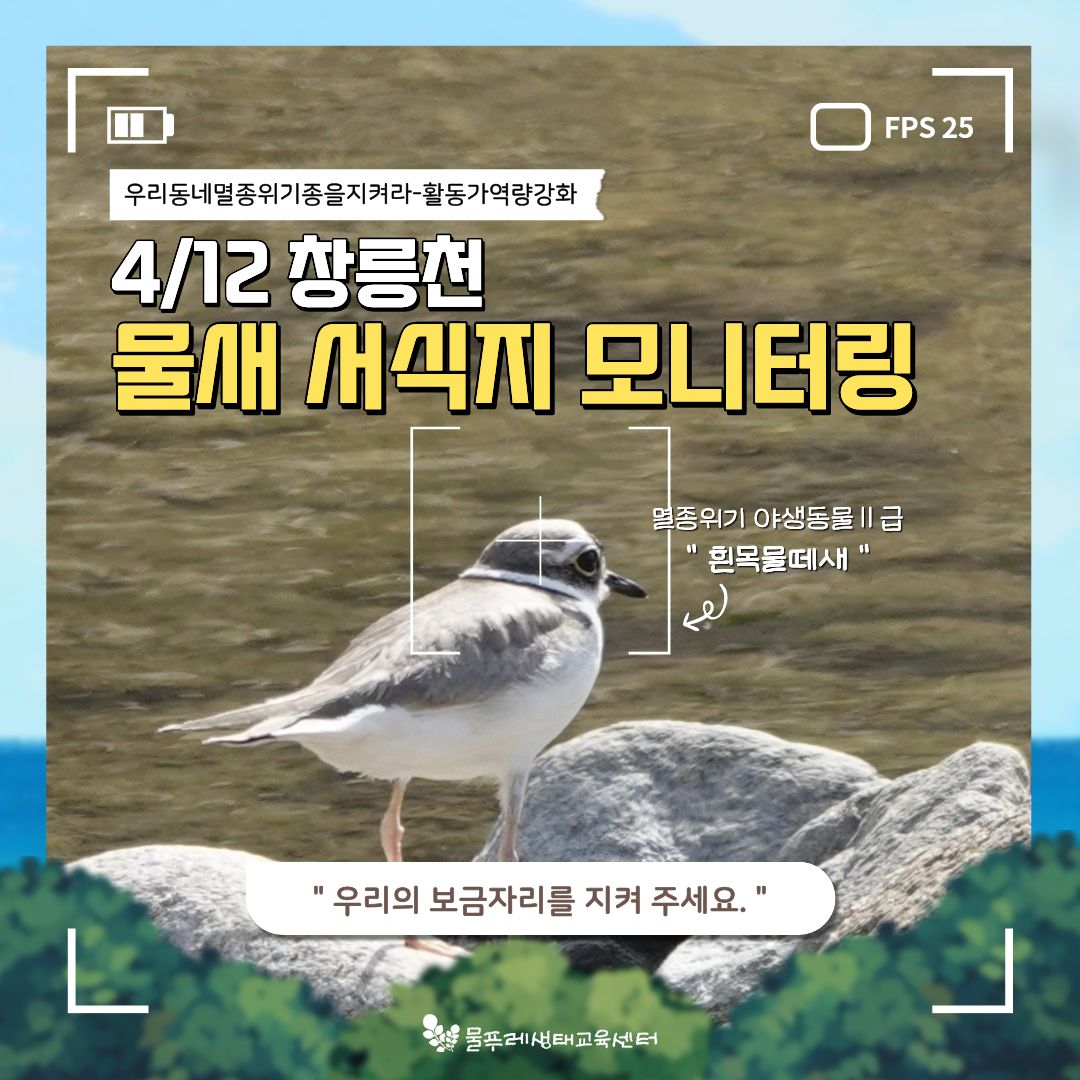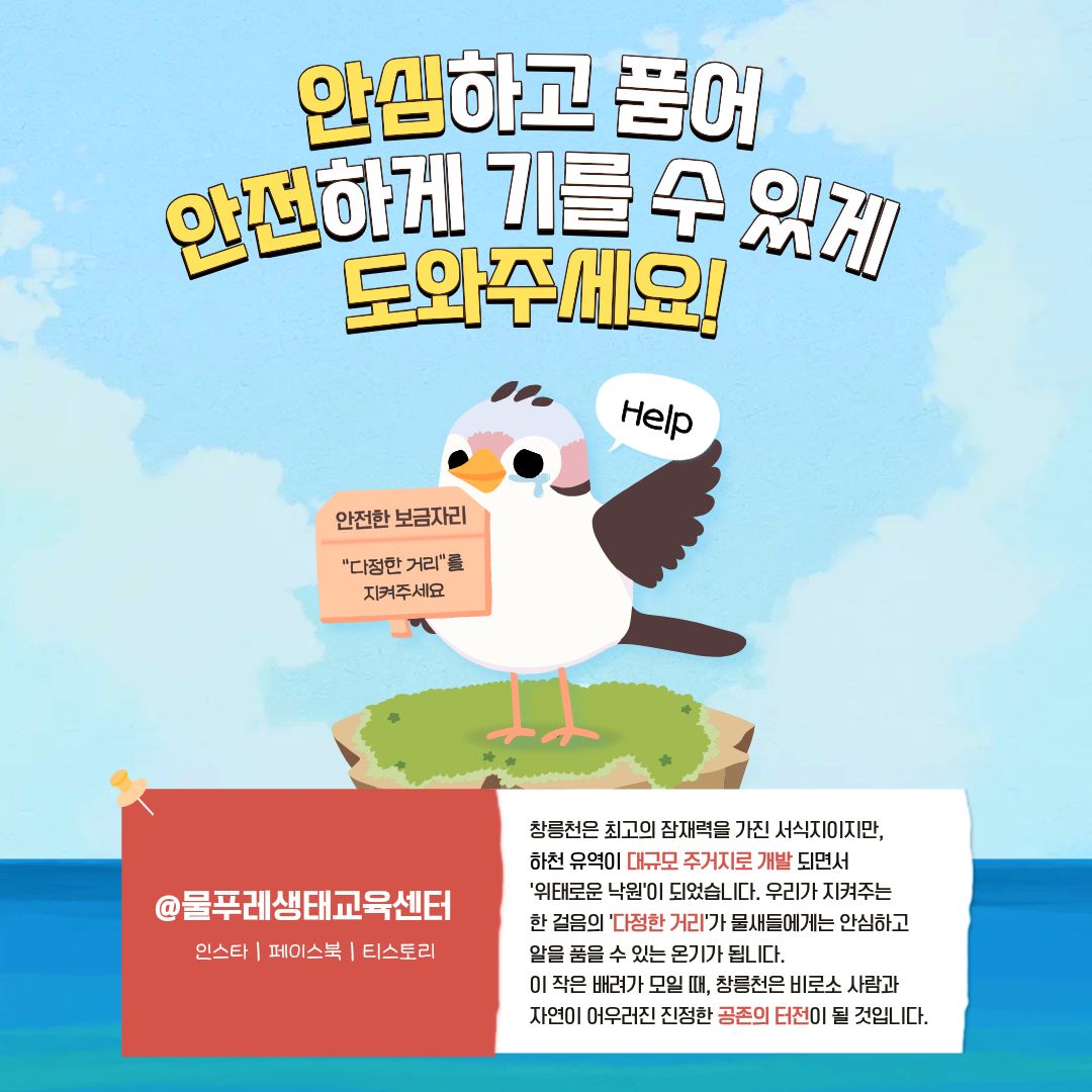 작은 배려가 모일 때, 창릉천은 비로소 사람과 자연이 어우러진 진정한 공존의 터전이 될 수 있습니다. 우리 곁의 작은 이웃, 물새들이 안전하게 새끼를 기를 수 있도록 함께 지켜봐 주세요! 🌎💚