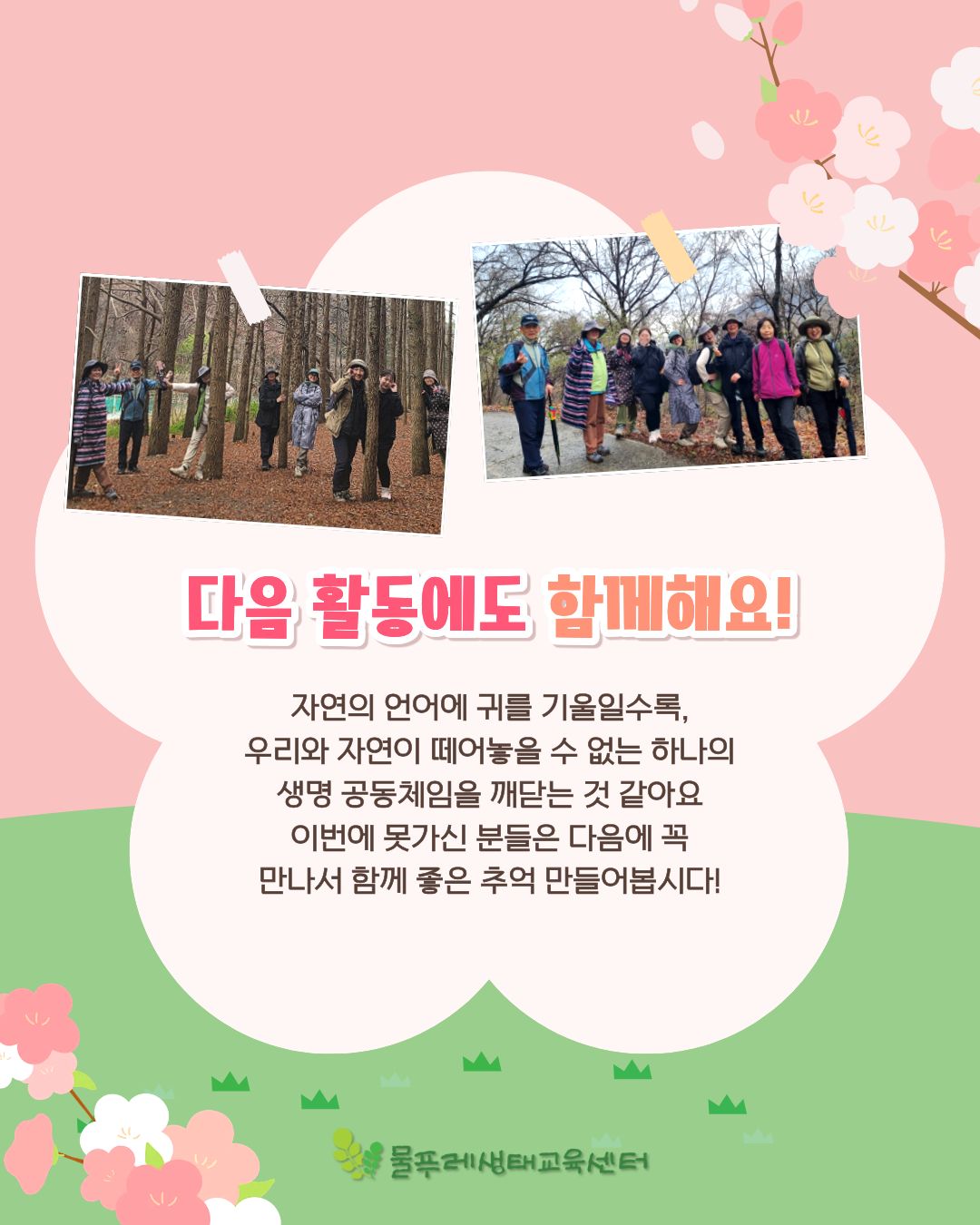 사진을 넘겨보며 함께했던 그날의 기억을 다시금 떠올려 보셨으면 좋겠습니다. 우리 그날의 따뜻했던 경험을 잊지 말고 소중히 간직하기로 해요! 이번에 아쉽게 함께하지 못한 분들도 다음 나들이에는 꼭 뵙기를 기다릴게요. 😊