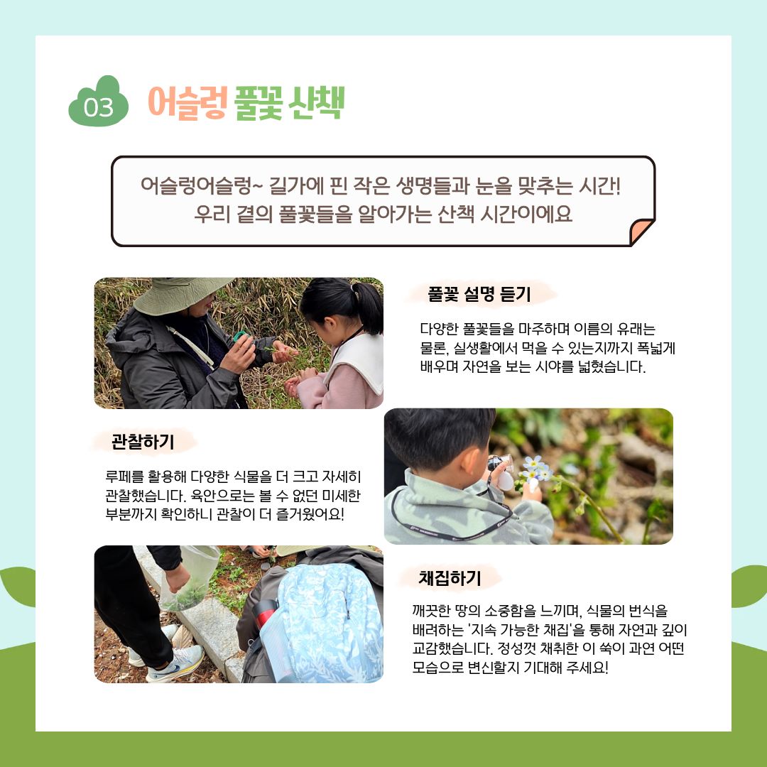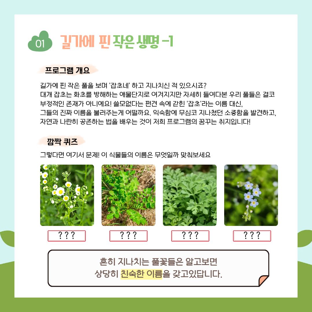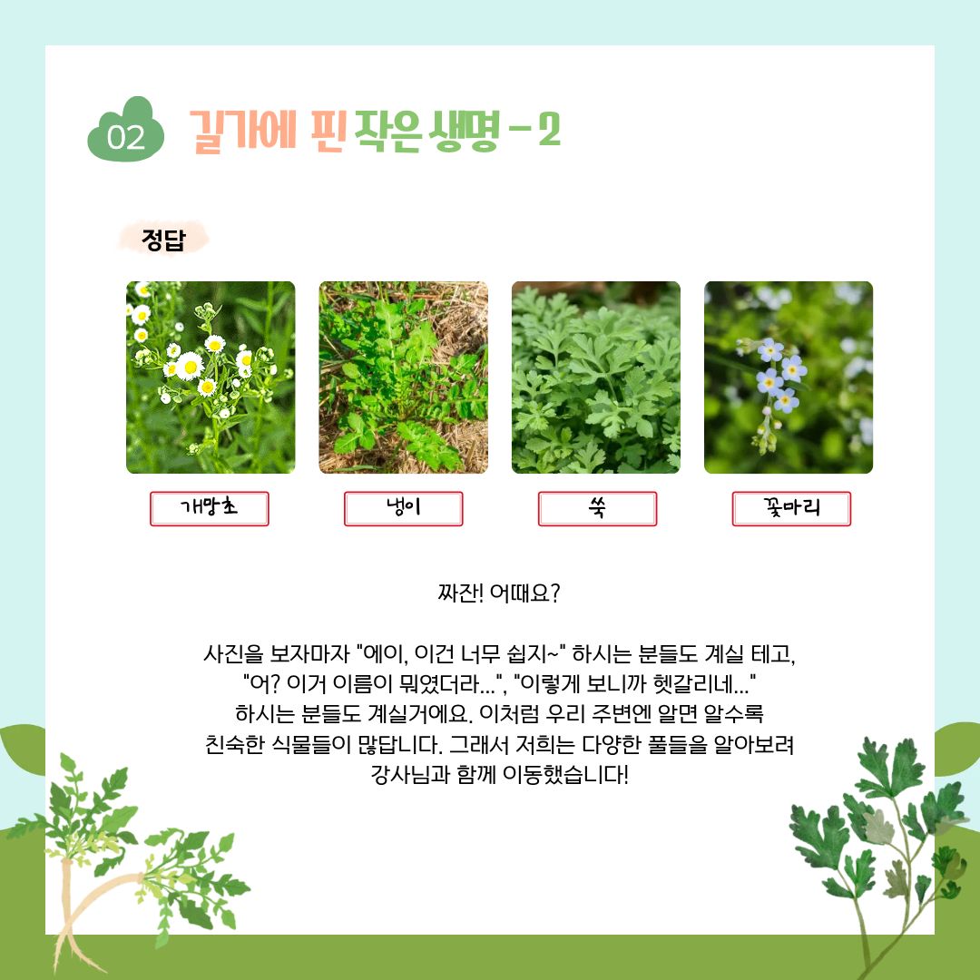 -발밑에 피어난 작은 풀꽃들의 이름과 재미있는 유래를 배우며 식물 친구들과 통성명을 나눴어요.