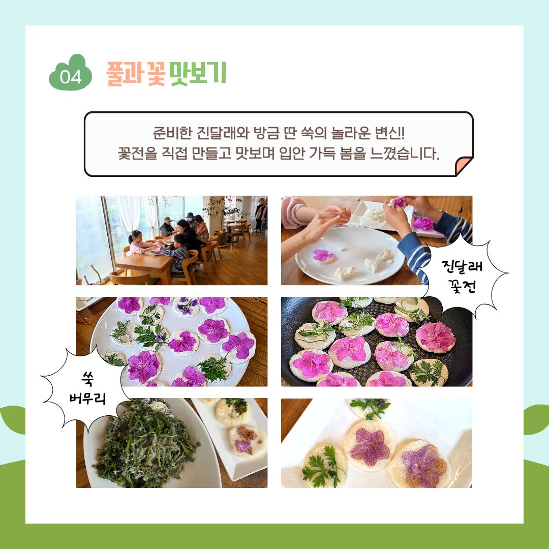 -눈으로만 보던 풀들 중 먹을 수 있는 식용풀을 구분해 보며 진달래로 화전도 만들어 먹었답니다!😋