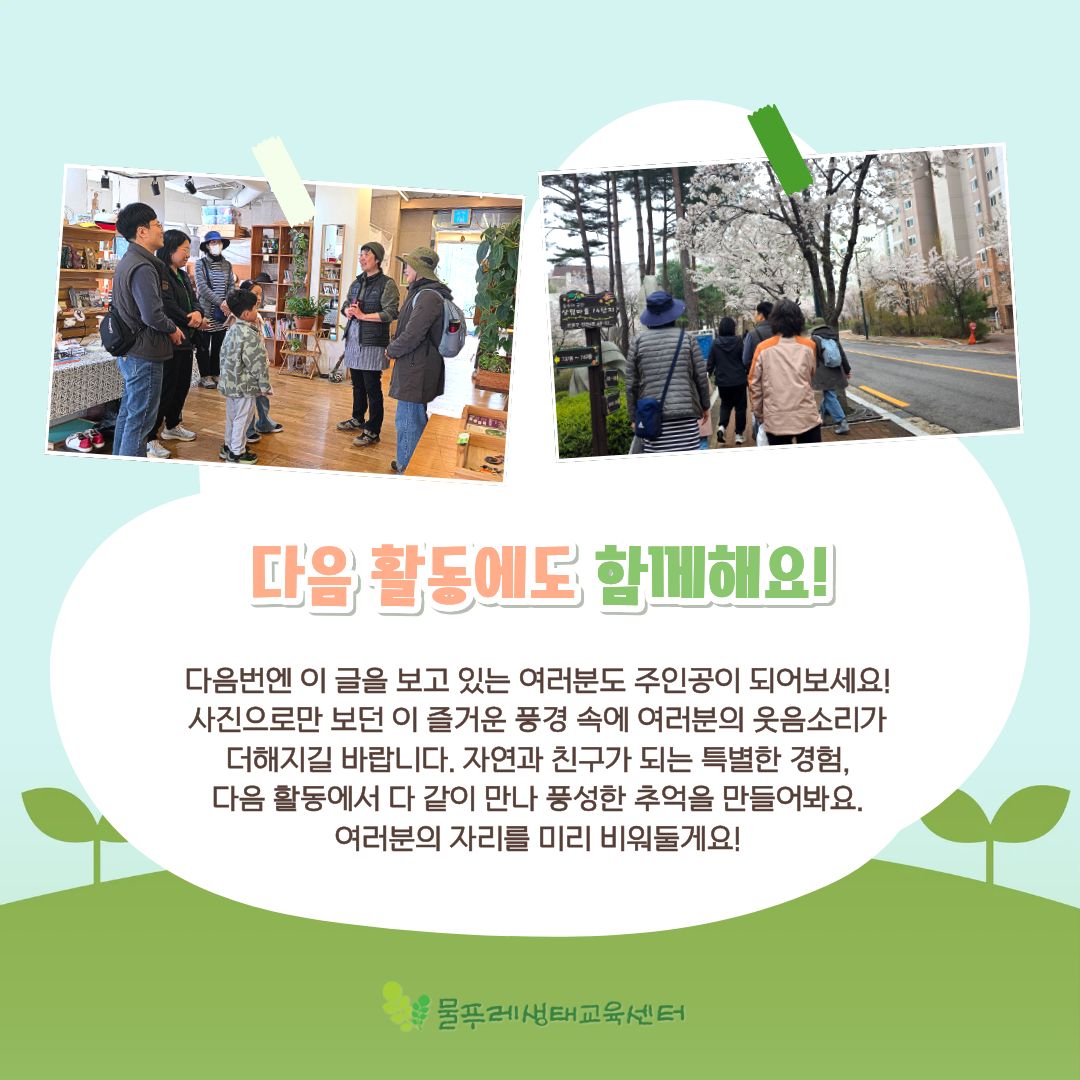 지난 4월 11일 토요일, 햇살 가득한 물푸레북카페가 향긋한 꽃내음으로 물들었어요! ☕✨ 이번 시간에는 우리 주변의 작은 생명들을 직접 만나보는 '먹는 꽃 먹는 풀' 프로그램을 진행했답니다.